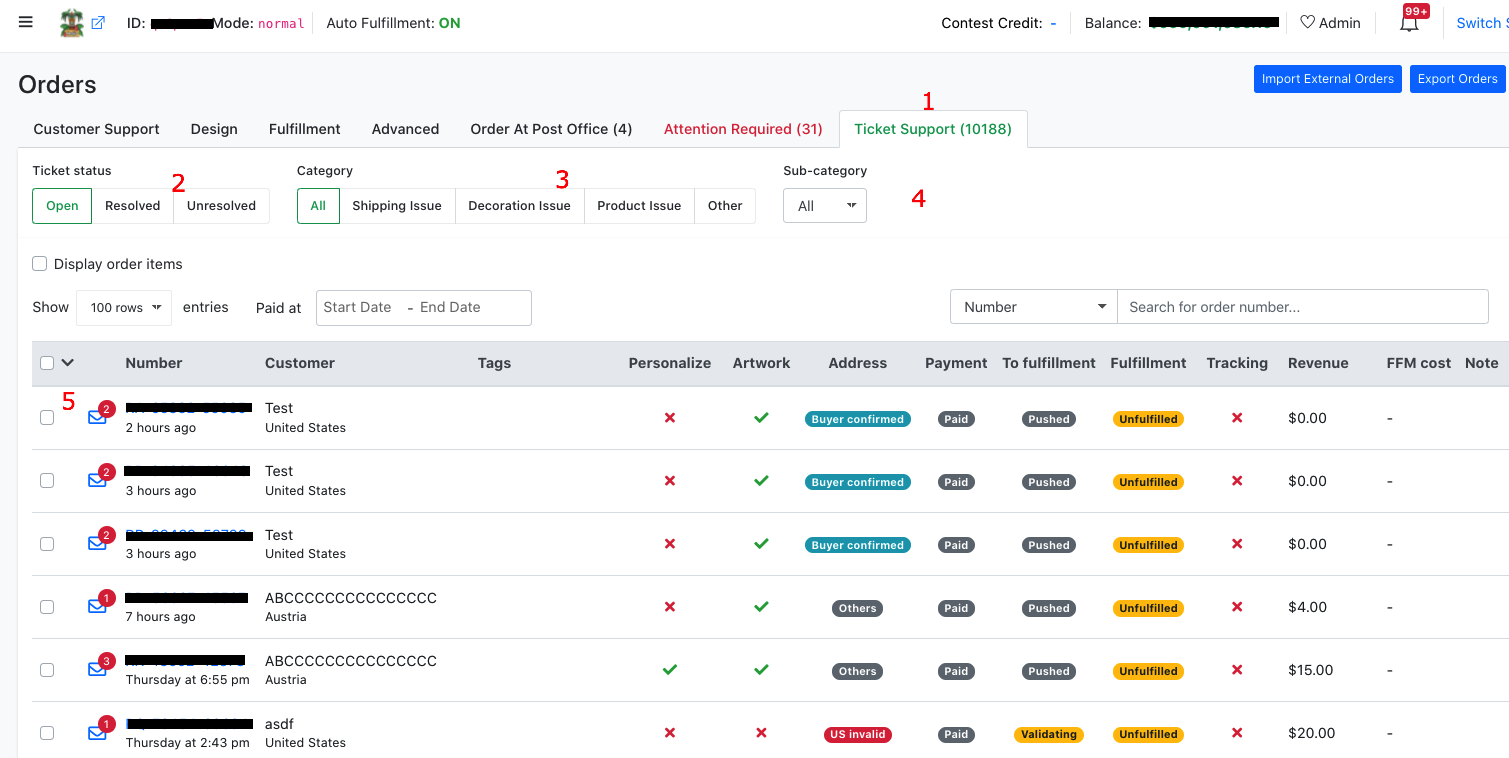 Tại đây, seller có thể tạo ticket mới bằng button "Create ticket", xem các update chưa đọc ở các ticket có title màu xanh, hoặc xem lại các ticket đã được giải quyết có title màu đen và ở trạng thái resolved/ unresolved.