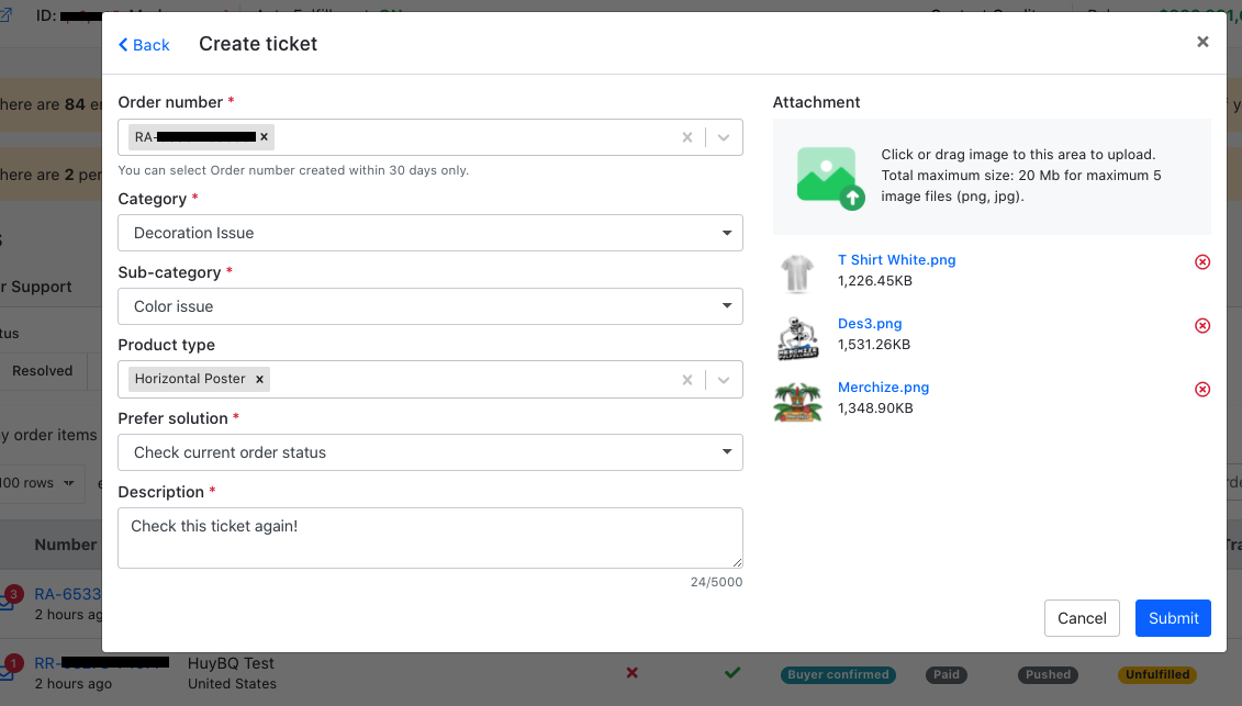 Cho phép seller tạo các yêu cầu hỗ trợ cho 1 hoặc nhiều Order trên hệ thống, giúp quản lý các vấn đề về đơn hàng tập trung và hiệu quả hơn thay vì rải rác qua nhiều kênh khác nhau.
