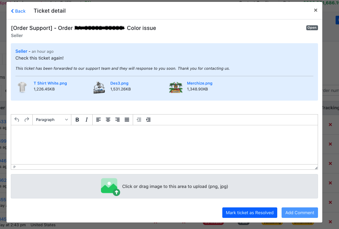 Seller có thể xem nội dung đã trao đổi với Support của Merchize, nếu thấy phản hồi của support phía Merchize đã đáp ứng được yêu cầu, seller có thể bấm "Mark ticket as Resolved" để đóng yêu cầu hỗ trợ.