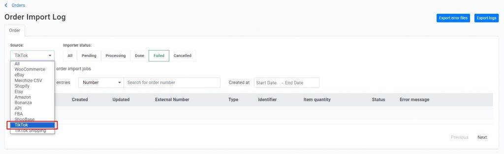 - Để xem tất cả các đơn hàng TikTok Seller Shipping, từ trang “Order import log”, trong mục “Source”, chọn “TikTok”.