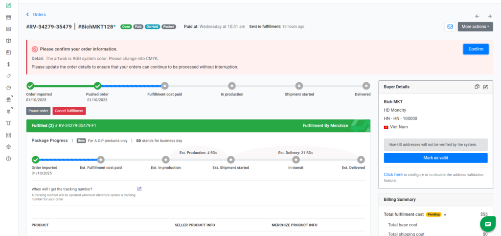 Trong tình huống này, Merchize sẽ cần Seller xác nhận thì đơn hàng mới được tiếp tục xử lý.