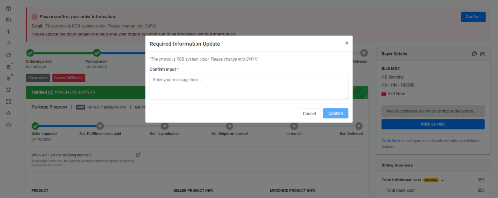 Merchize vừa ra mắt một tính năng mới cho phép hệ thống gửi yêu cầu xác nhận đến người bán. Tính năng này giúp đảm bảo tất cả thông tin và vấn đề liên quan đến đơn hàng được xử lý chính xác và Seller phê duyệt trước khi tiến hành sản xuất và vận chuyển.